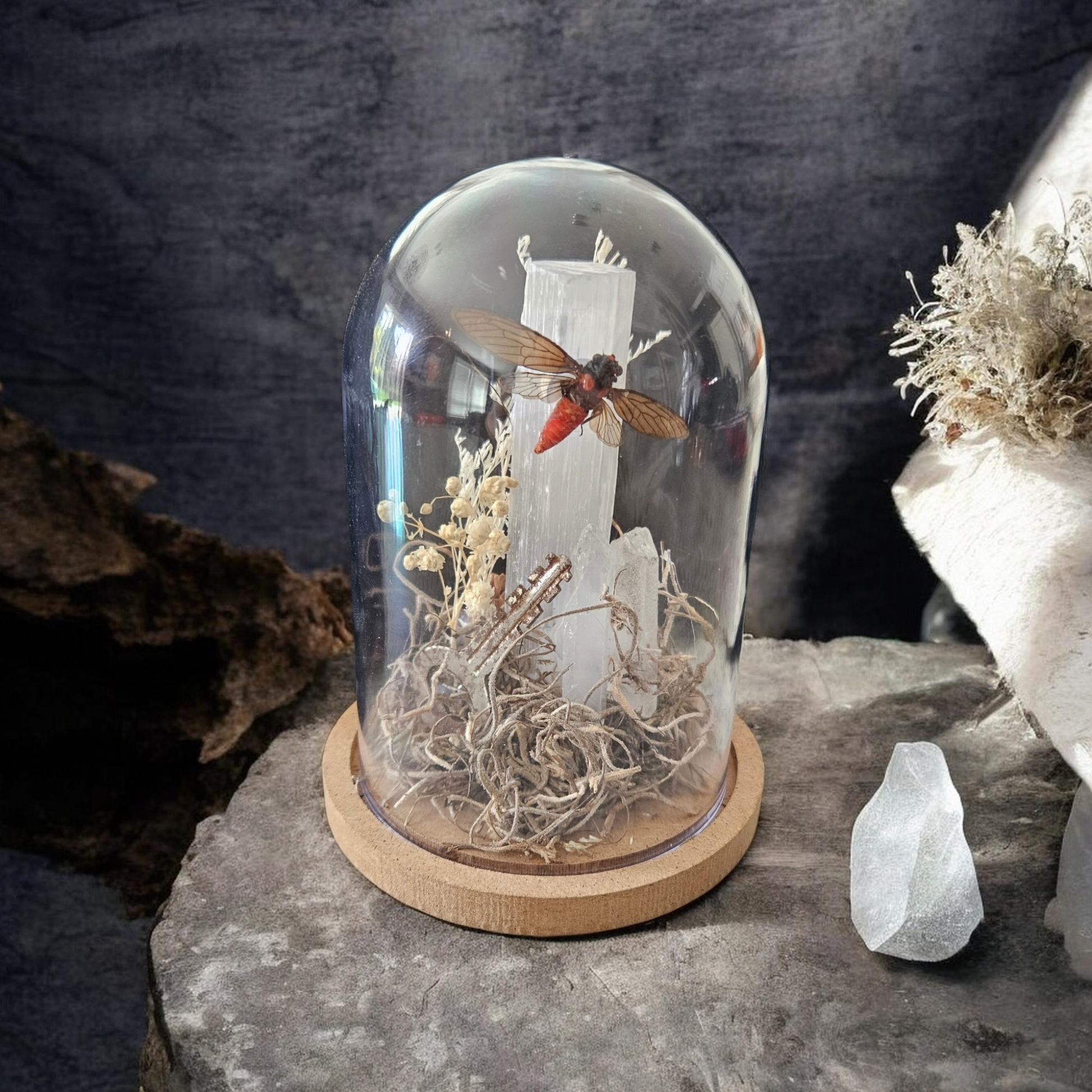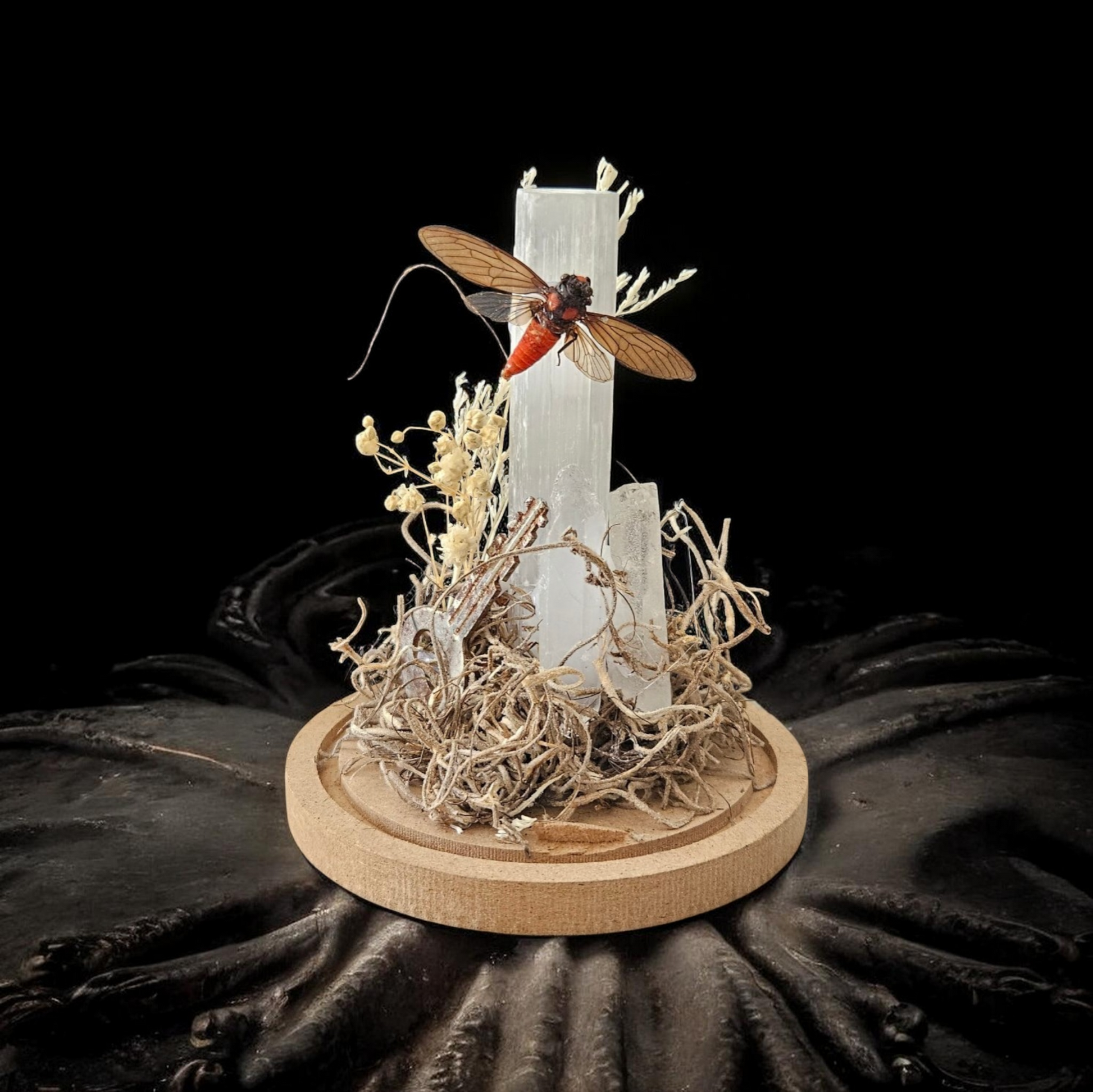 Hueychys incarnata (The Red Devil Cicada, native to SE Asia, they're petite red-bodied, sepia milk-window paneled wings) displayed on a selenite tower 🦋🦋